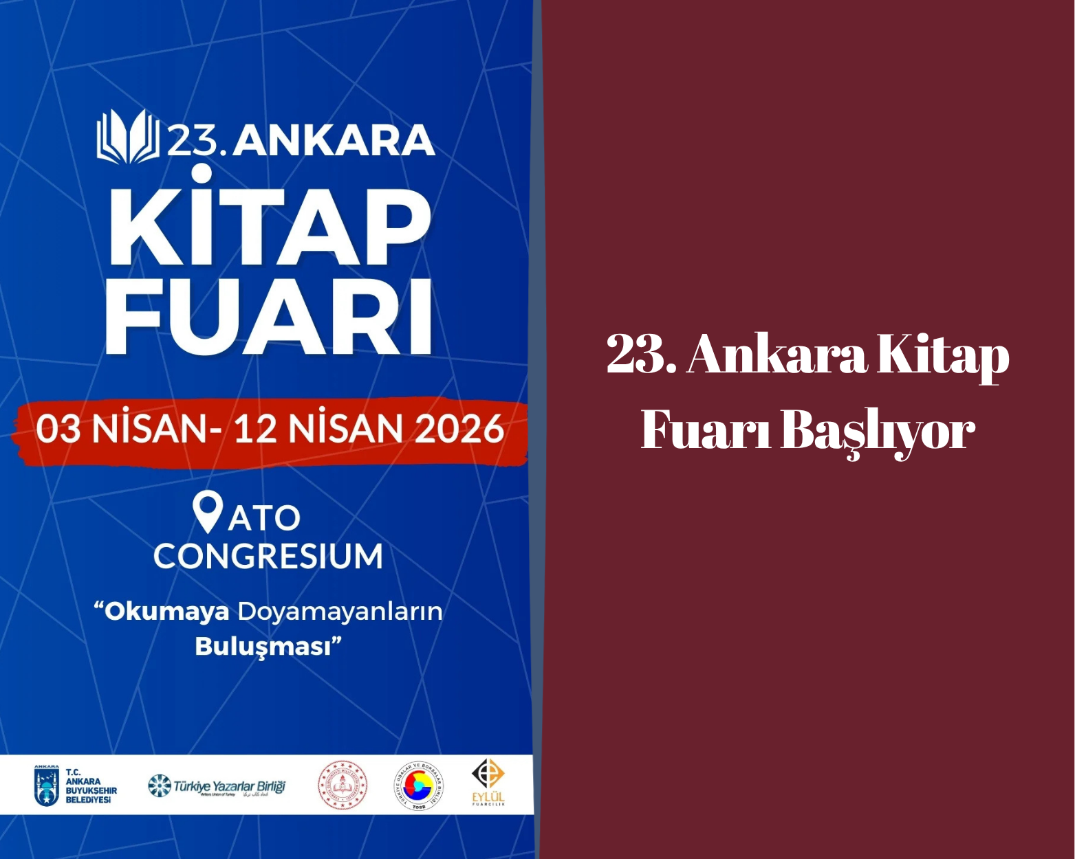 Ankara Kitap Fuarı, 3 Nisan’da kapılarını açıyor. Eylül Fuarcılık tarafından düzenlenen fuar, 12 Nisan’a kadar ATO Congresium’da kitapseverleri ağırlayacak.