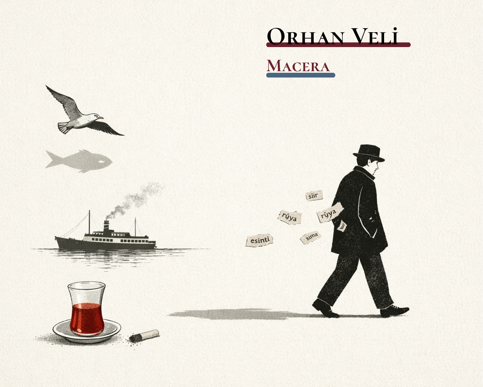 Orhan Veli, Melih Cevdet ve Oktay Rıfat ile birlikte Garip akımını kurduğunda ağır söz sanatlarına, kurallara, aruza hece ölçüsüne karşı çıkmış, şiirde sadeliği savunmuştu. Büyük anlatıların yerine küçük insanların hayatlarını taşımıştı şiire. Kısa süren ömrü ve geride az eser bırakmasına rağmen edebiyatımızda yerini korumayı başarmıştır. Şiirleri hâlâ okunmakta, sevilmektedir. Burası bir şiir ve bu şiir Orhan Veli’nin Macera şiiri.